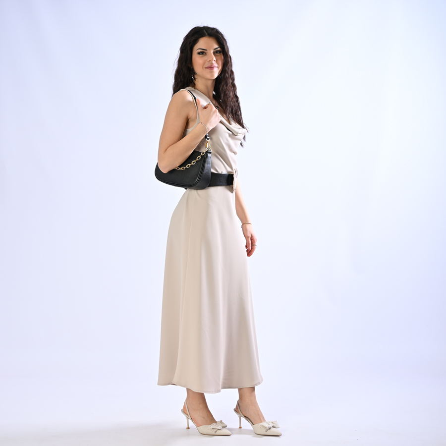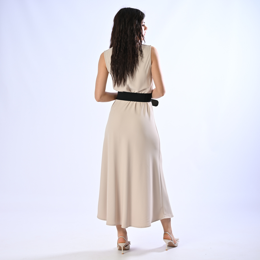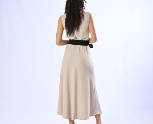 Abito smanicato con elastico dietro, svasato e scollo drappeggio