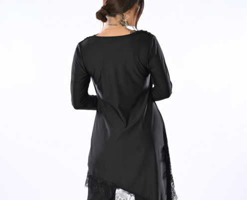 Abito asimmetrico con pizzo e scollo a drappeggio