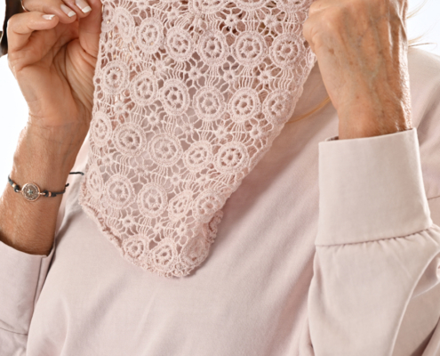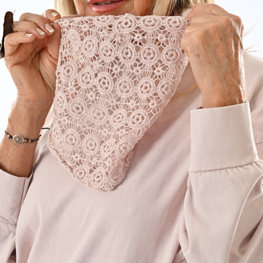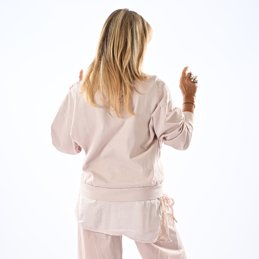 Completo con maglia con inserto di raso e pizzo e pantalone a palazzo con folard incluso