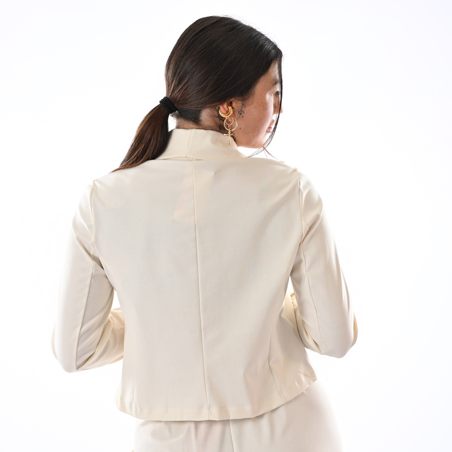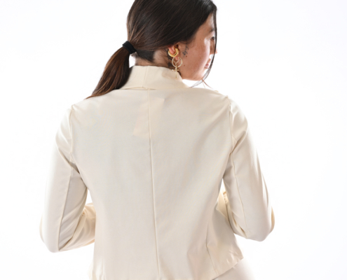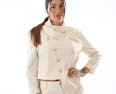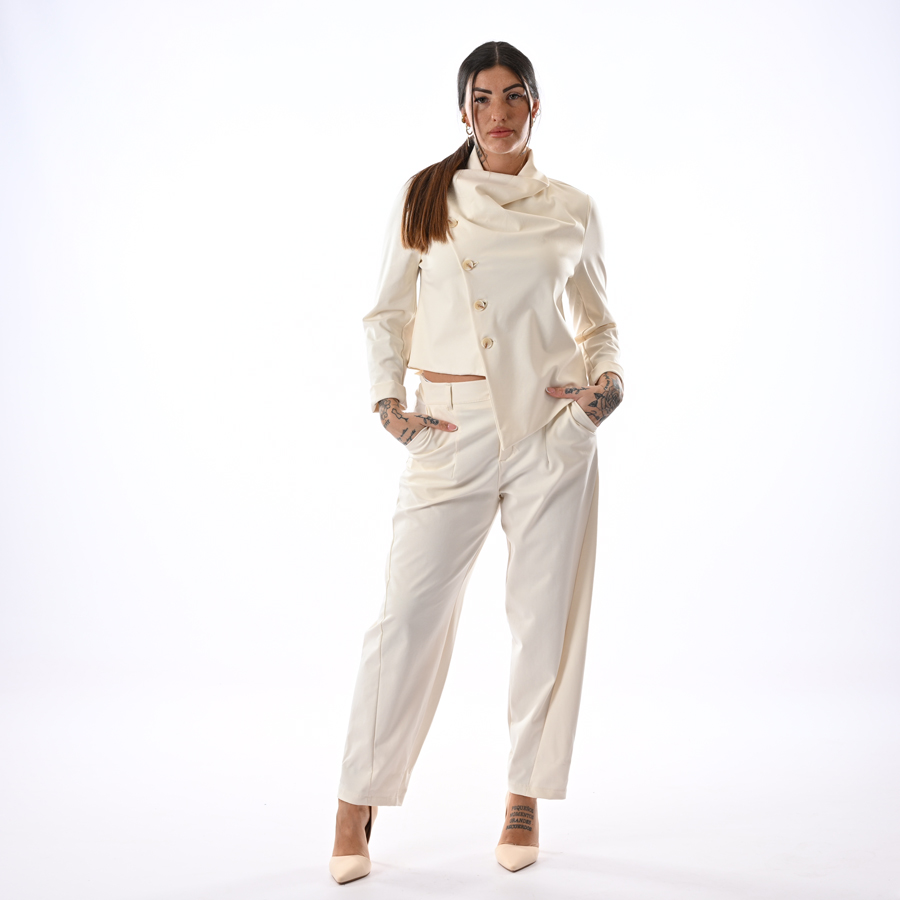 Completo in punto milano con giacca asimmetrica e pantalone a ovetto