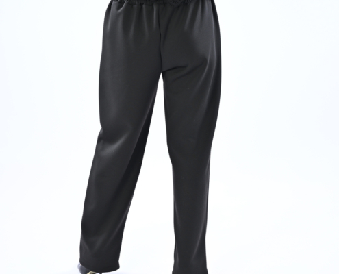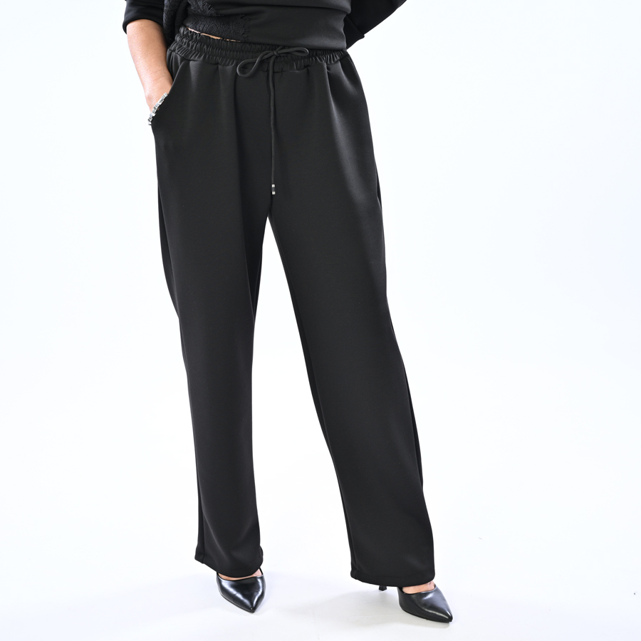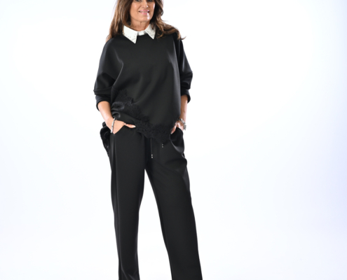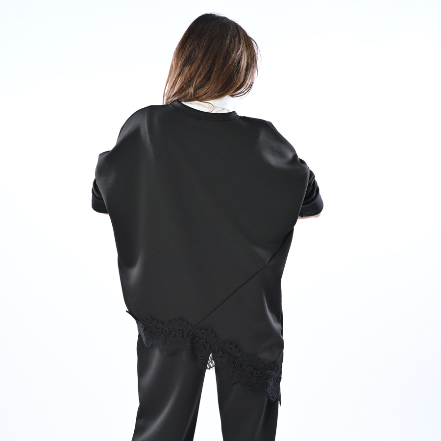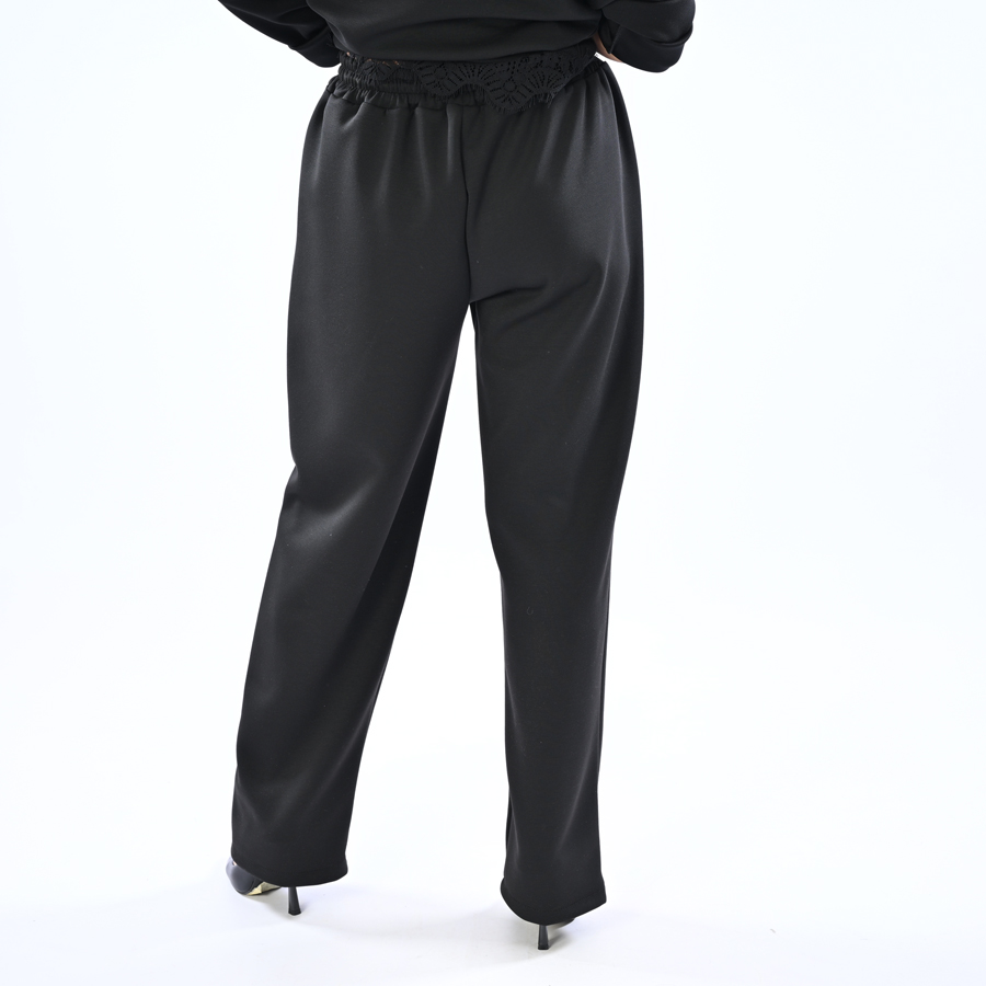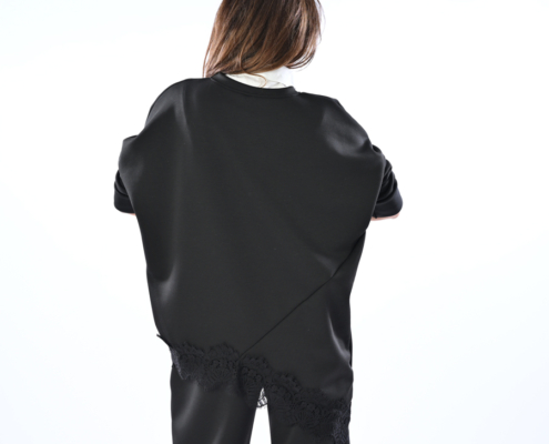 Completo sport con maglia più lunga da un lato con dettagli in pizzo sopra e sotto e pantalone con elastico in vita