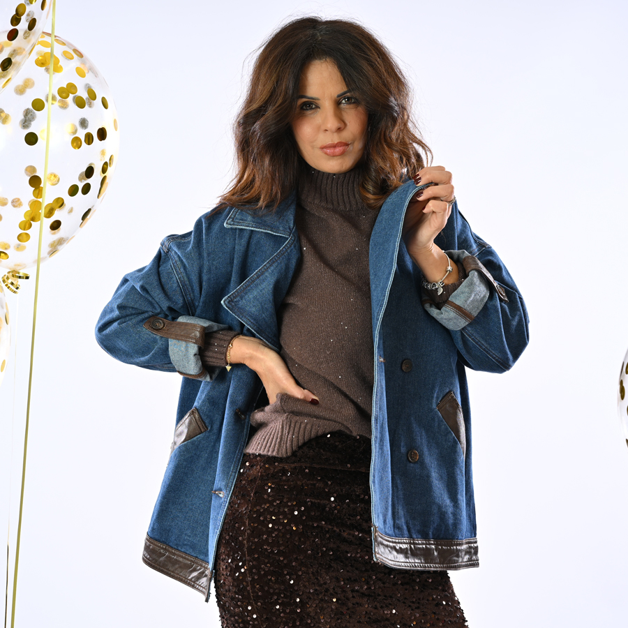 Giacca di jeans con inserti in ecopelle cacao