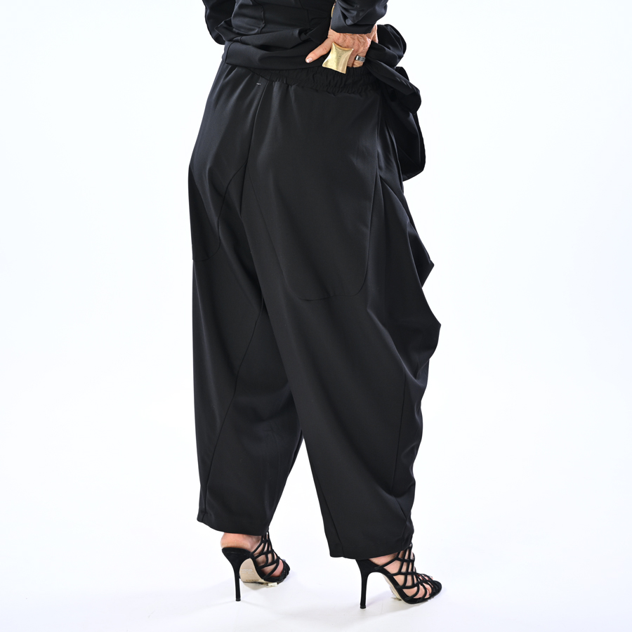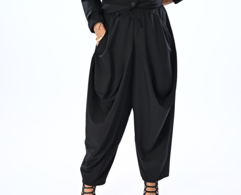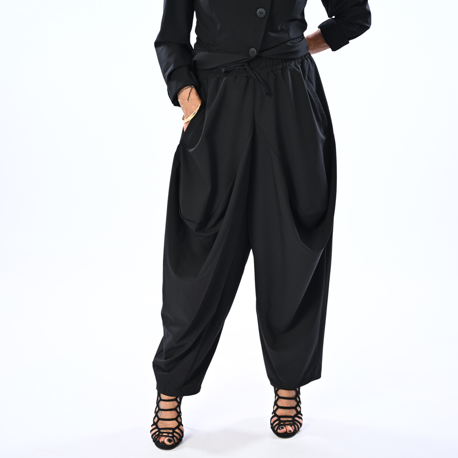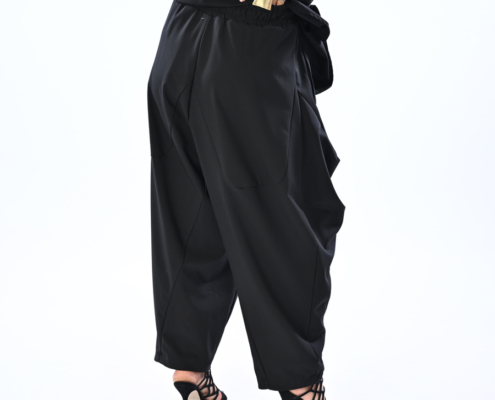 Pantalone con cavallo basso e arricciture